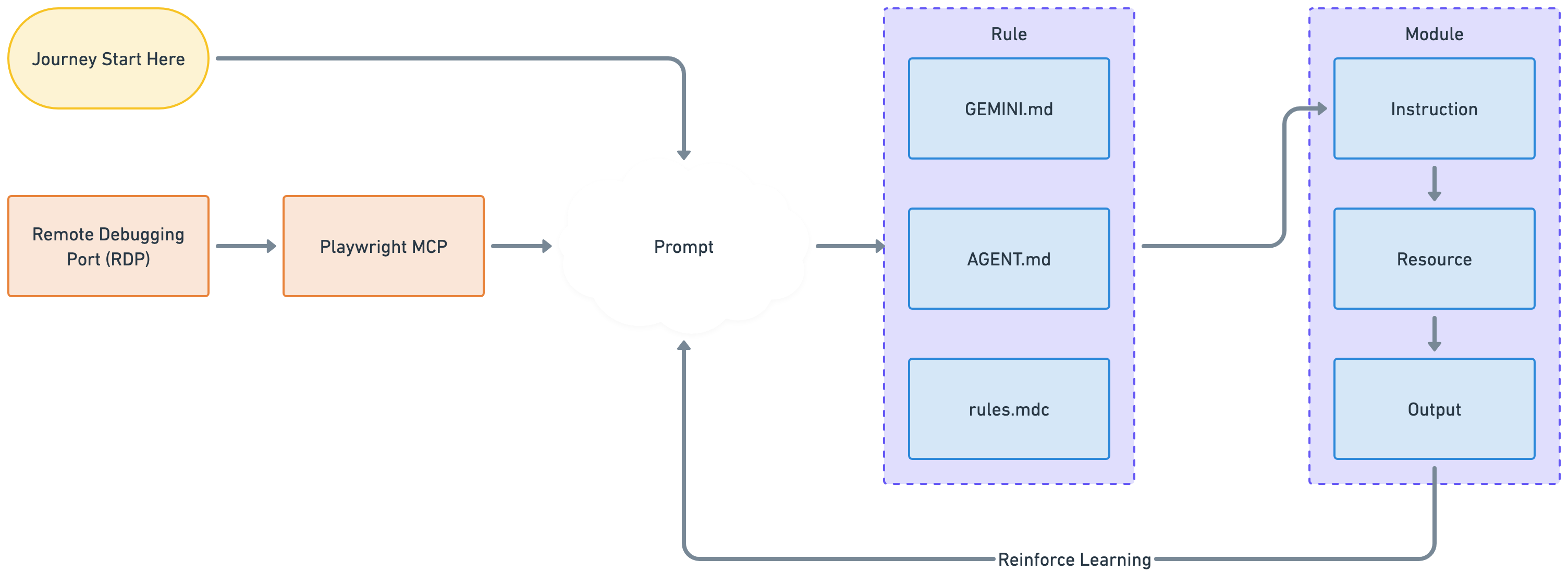 The journey begins with the Journey Start. The agent connects to the existing browser session (via the Remote Debugging Port). This is crucial because it means the agent is logged in as the user, skipping all the complex authentication steps.