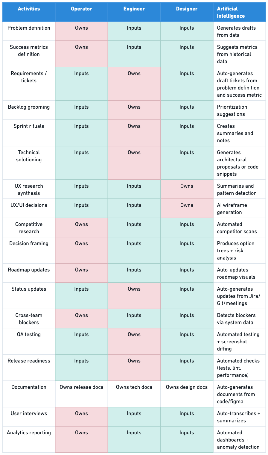 This list is an intentional simplification of how activities are shared across the Product Conductor, Engineering, and Design functions. It provides a clean way to clarify ownership without going into every exception or team specific variation. QA responsibilities are not listed separately because they are treated as part of Engineering within this model.